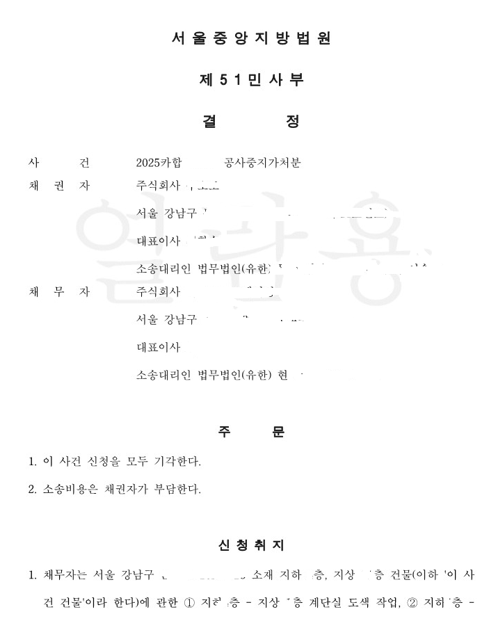 오늘은 #공사중지가처분 소송에서, #피신청인 #채무자 를 대리하여 승소한 #가처분 사건을 소개하려고 합니다.