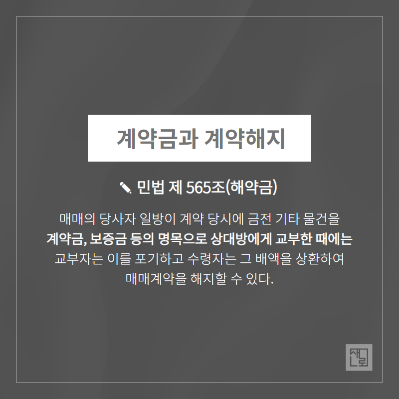 매매의 당사자 일방이 계약 당시에 금전 기타 물건을 계약금, 보증금 등의 명목으로 상대방에게 교부한 때에는 교부자는 이를 포기하고 수령자는 그 배액을 상환하여 매매계약을 해지할 수 있다