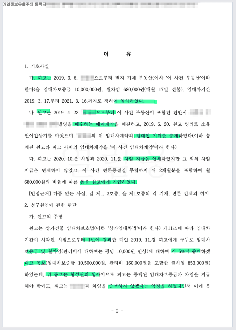 또한 증액된 월세를 지급하지 않았다 하더라도 월세 미지급에 해당하지 않으므로 갱신거절 사유가 되지 않으며