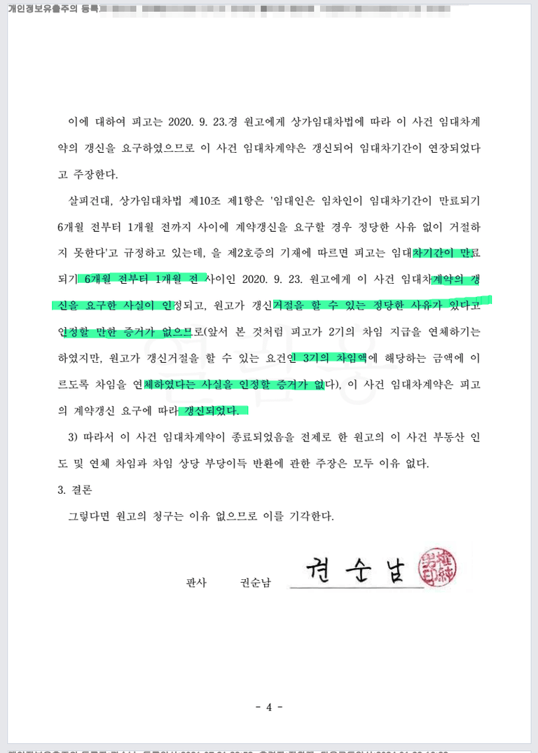임차인 또한 정해진 기간 내에 갱신요구를 하였고 이를 거절한 사유가 충분하지 않으므로