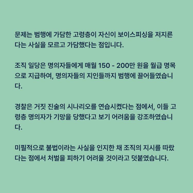 문제는 해당 범행에 가담한 고령층이 자신이 보이스피싱을 저지른다는 사실을 모르고 가담했다가 결국에는 깊은 수렁에 빠져든다는 점입니다. 이들 일당은 명의자들에게 매월 150만 원에서 200만 원의 수당을 월급 명목으로 지급하였습니다. 또한 명절 상여금을 지급하고, 명의자들의 지인들까지 범행에 끌어들였습니다.