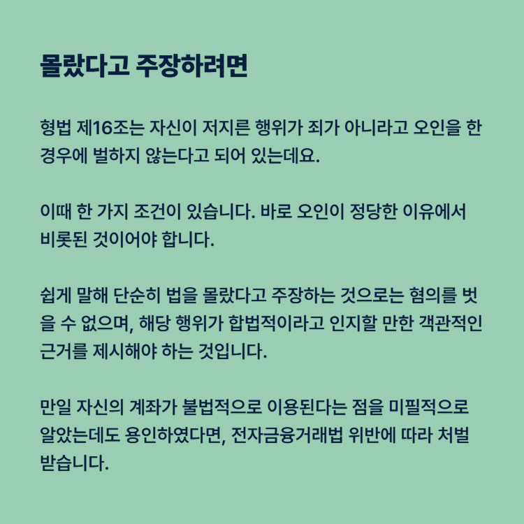 쉽게 말해 단순히 법을 몰랐다고 주장하는 것으로는 혐의를 벗을 수 없으며, 해당 행위가 합법적이라고 인지할 만한 객관적인 근거를 제시해야 하는 것입니다. 만일 자신의 계좌가 불법적으로 이용된다는 점을 미필적으로 알았는데도 용인하였다면, 전자금융거래법 위반에 따라 처벌받습니다.