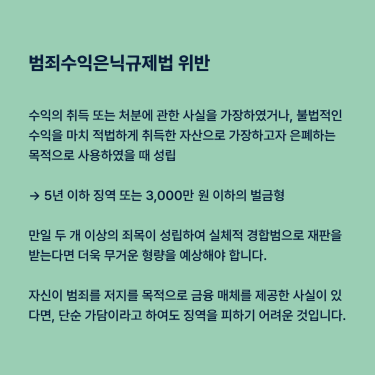 위 사례는 불법적인 용도로 금융 매체가 사용됨을 알고도 타인의 통장과 계좌 정보를 넘겨 전자금융거래법 위반으로 재판을 받고 감형된 경우입니다. 이와 함께 자신의 계좌가 보이스피싱에 이용되도록 제공하였다면 추가로 범죄수익은닉규제법 위반에 해당할 수 있습니다.