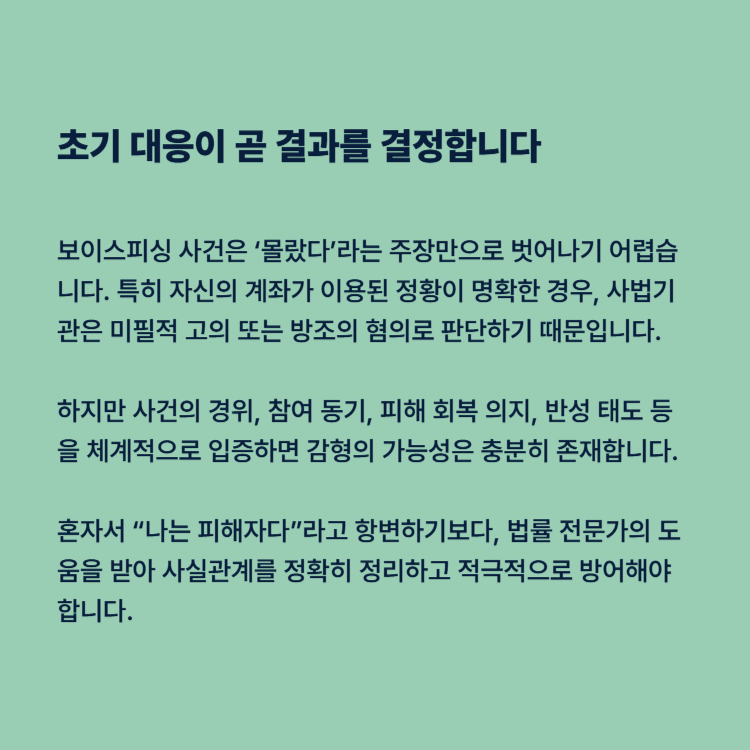 보이스피싱 사건은 ‘몰랐다’라는 주장만으로 벗어나기 어렵습니다. 특히 자신의 계좌가 이용된 정황이 명확한 경우, 사법기관은 미필적 고의 또는 방조의 혐의로 판단하기 때문입니다.