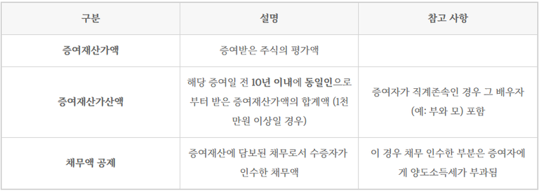 증여세 과세가액은 다음 항목들을 모두 반영하여 계산합니다.