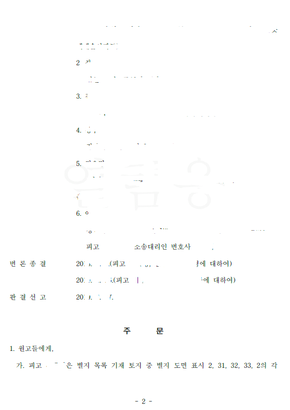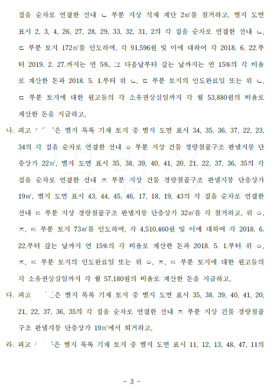 판결문에 나와 있는 것처럼, 주문이 매우 복잡하고 깁니다. 각 침범한 토지를 도면으로 정확히 특정해야 하고, 침범한 토지에 대한 기간 별 부당이득금을 감정평가하여 액수를 특정하여야 하기 때문입니다.