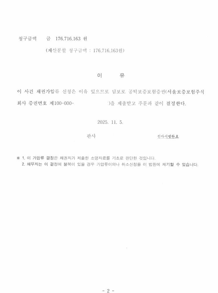 그 결과 법원은 1.7억 가압류 결정을 내리면서 단지 260만원 현금공탁, 나머지 잔액은 증권으로 갈음을 할 수 있게 하는 결정을 하였습니다.