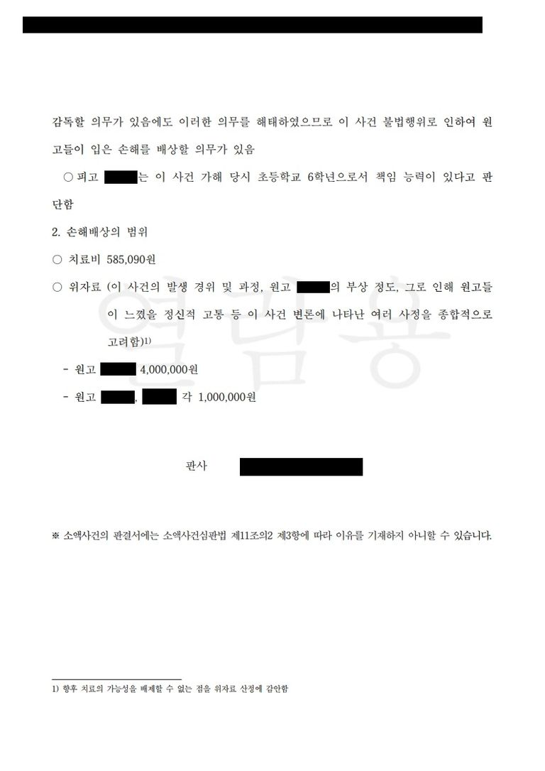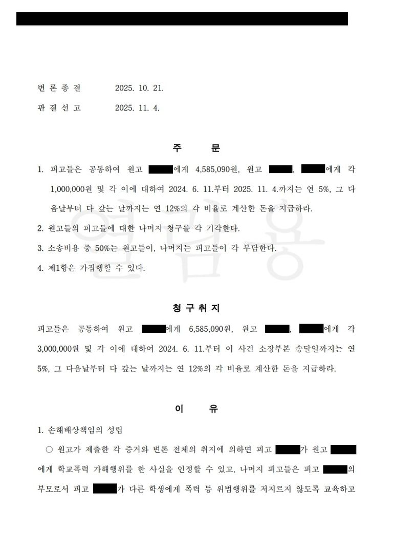 그 결과, 피해 학생 측이 실제로 지출한 치료비는 60만 원에도 못 미쳤지만, 그럼에도 당사자들의 정신적 고통이 컸음을 인정받아 위자료로서 본인에게는 400만 원을, 부모에게는 각 100만 원을 인정받을 수 있었습니다.