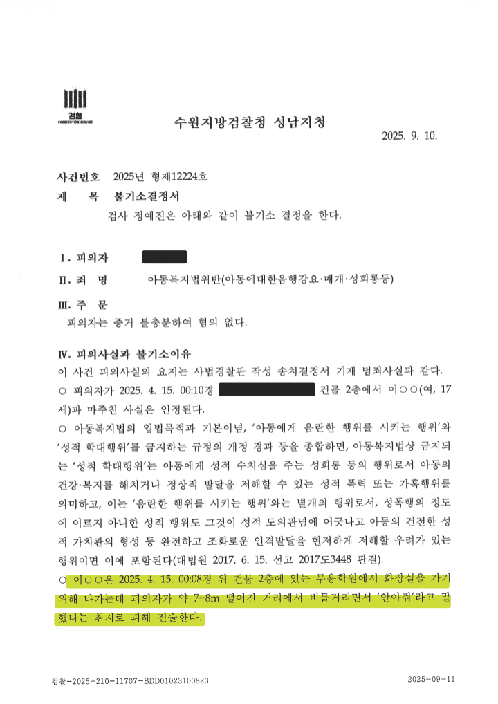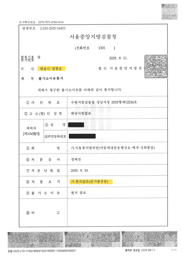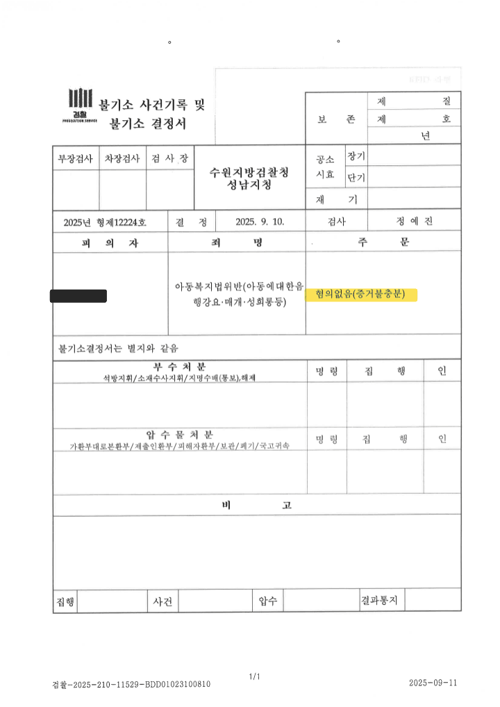 이 사건을 담당하였던 경찰은 혐의가 인정된다는 취지로 검찰에 송치하였습니다. 그런데 사건을 송치받은 검사는 ‘혐의없음(증거불충분)’ 처분을 내렸습니다. 왜 그랬을까요?