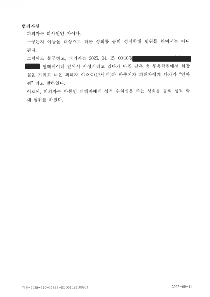 최근 실제로 비슷한 사건이 있었습니다. 술에 취한 남성이 건물 복도를 배회하다가 무용복을 입은 여학생에게 “안아줘”라고 말했지만, 신체접촉은 없었습니다.