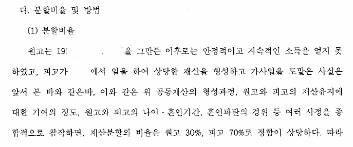 본 사건에서는 30년 이상의 혼인기간 동안 경제활동과 가사노동을 병행하며 가정을 지켜온 당사자에게 70%의 높은 재산분할비율이 인정되었습니다.