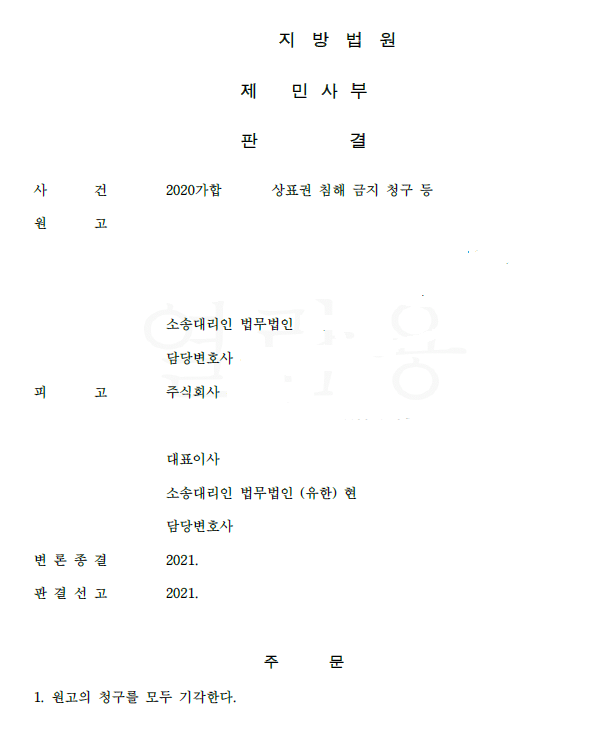 본 사례에서 제 의뢰인은 피고로서 건설업을 하시는 업체인데 상표를 출원하고 있지 않고 자신의 상호를 약간 변형하여 상표로 사용하고 있다가, 경쟁업자(원고)가 상표 출원을 하고 제 의뢰인(피고) 상표권 침해를 주장하며 상표권 침해 중지 및 #손해배상 청구를 한 사안입니다.