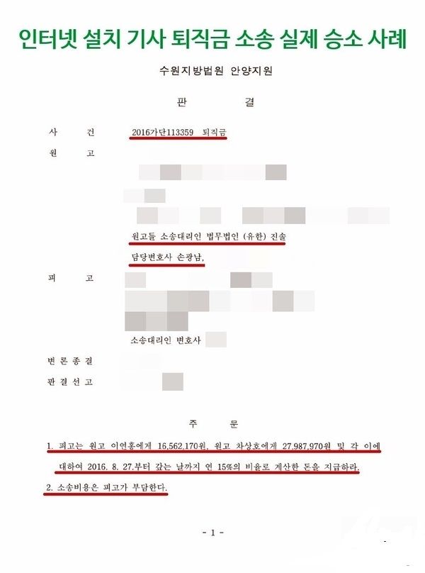오늘은 인터넷 설치 기사의 퇴직금 소송(퇴직금 지급 청구 소송) 승소 사례를 소개하려고 합니다.