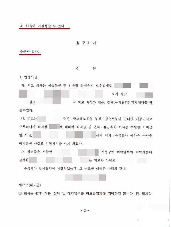 그러던 중, 고용노동청으로부터 시정지시를 받게 되고, 원고들을 포함한 LG유플러스, SK브로드밴드의 개통장애 위탁업무의 수탁자들이 결성한 민주노총 서울본부 희망연대 노동조합은 인터넷 설치 업체(피고)와 단체협약을 체결합니다. 위 단체협약을 통해 원고들은 정직원이 되었으나, 원고들은 피고와 그 동안의 퇴직금 등은 지급하지 않기로 하는 면책합의서를 작성하게 됩니다.