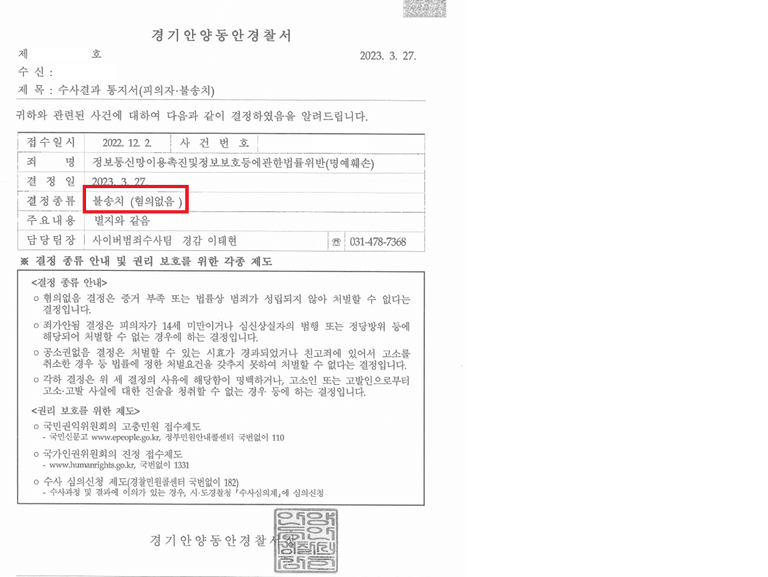 결국 모욕 및 명예훼손 모두 불송치(혐의없음) 처분이 내려졌습니다.