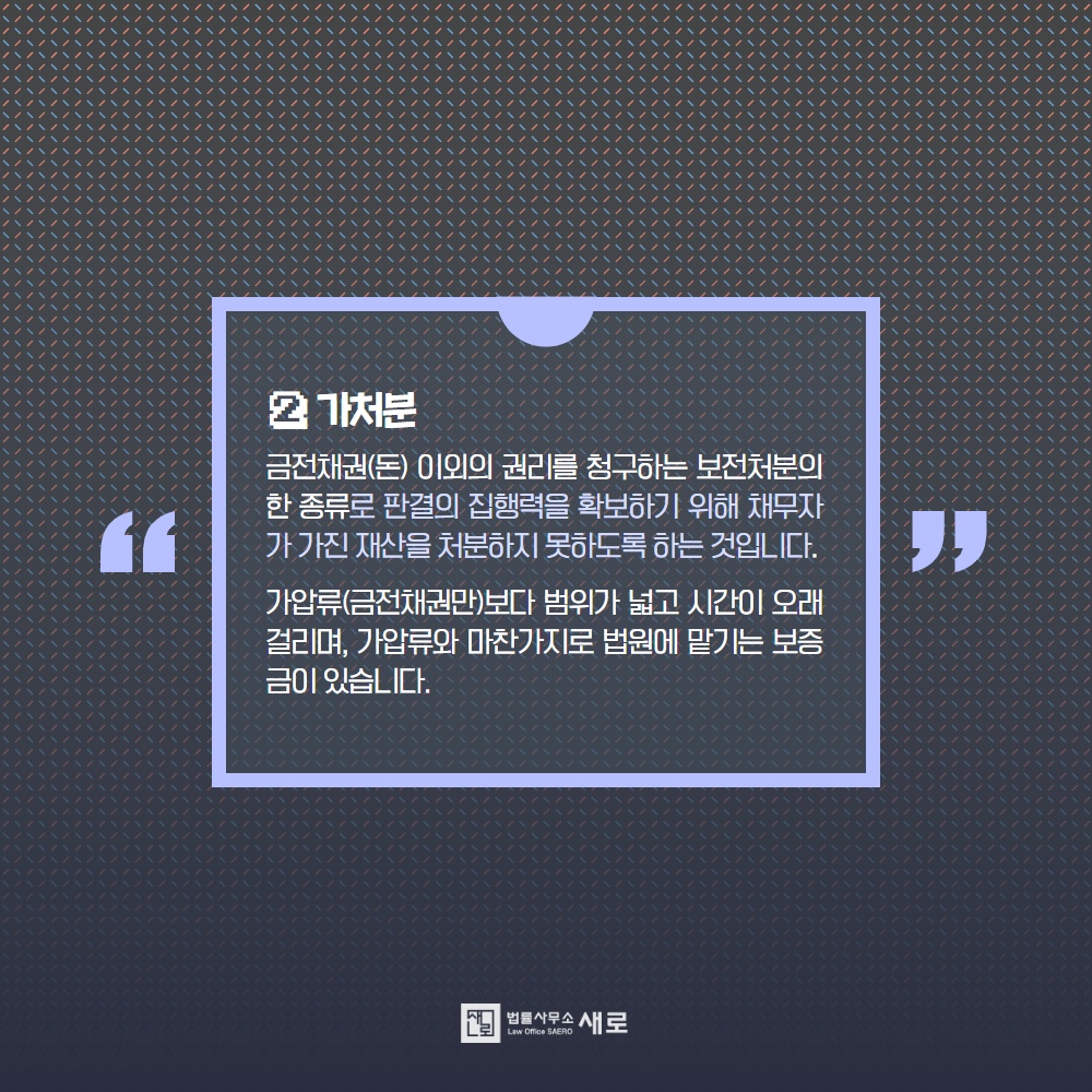 금전채권(돈) 이외의 권리를 청구하는 보전처분의 한 종류로 판결의 집행력을 확보하기 위해 채무자가 가진 재산을 처분하지 못하도록 하는 것입니다. 처분금지 가처분, 점유이전금지 가처분, 상호사용금지 가처분, 단행적 가처분 등이 있습니다. 그렇지만 가압류(금전채권만)보다 범위가 넓고 시간이 오래 걸리며, 가압류와 마찬가지로 법원에 맡기는 보증금이 있습니다.