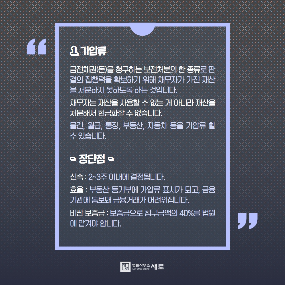 · 효율 : 부동산의 경우 등기부에 가압류 표시가 되고, 금융기관에 통보돼 금융거래가 어려워집니다. → 빠르고 효율적이며 압박 효과가 큰 장점이 있습니다.