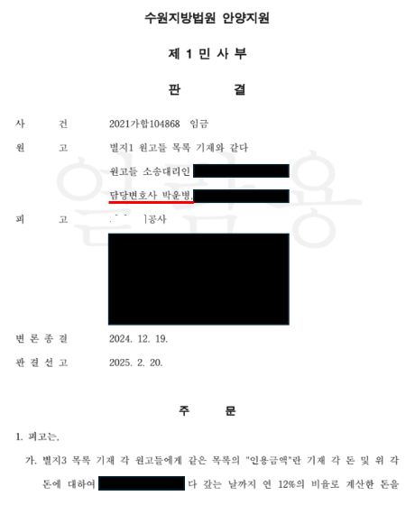 공공기관 성과급을 통상임금으로 인정받은 2025년 판결입니다. 이 사건은 2021. 10. A공사 임직원 200명을 대리하여 시작했고 무려 3년 3개월만에 결론이 났는데 그 사이 우여곡절이 많았습니다. 최종적으로는 전부 승소하여 평가급(공공기관 성과급), 반장수당, 특정업무수행경비, 명절수당, 직급수당이 모두 통상임금에 해당한다는 판결을 받았습니다.