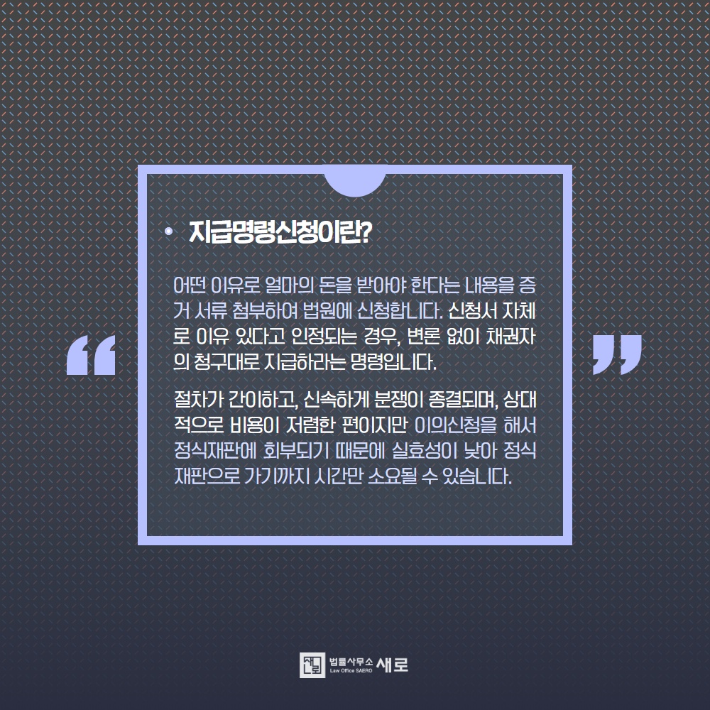 밀린 채무 관계를 신속하게 끝낼 수 있는 “지급명령” 제도가 있습니다.