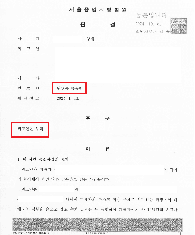 결국 본 사건은 ‘상해 혐의 전부 무죄 확정’으로 종결되었습니다.