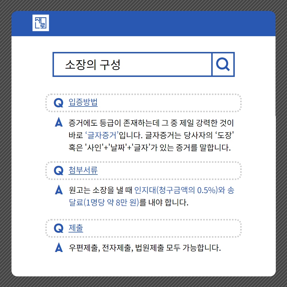 이번 포스트는 글씨체, 글씨 크기, 줄 간격 등 소장의 작은 부분에서 시작해 첨부서류에 이르기까지 소장의 모든 것을 다루고자 합니다. 준비한 예시를 함께 보면서 소장의 구성을 꼼꼼히 살펴보겠습니다!