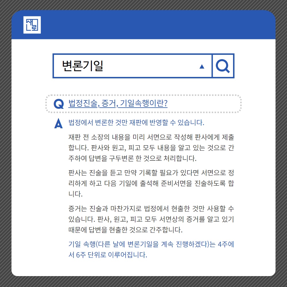 변론기일은 간단합니다. 법정에서 변론하는 날짜를 말하는데요, 법원에 피고의 답변서가 도착한 후 늦어도 3-4개월 내에 변론기일이 잡힙니다.