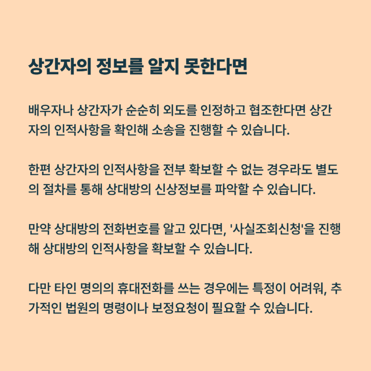 배우자나 상간자가 순순히 외도를 인정하고 협조한다면 상간자의 인적사항을 확인하여 수월하게 소송을 진행할 수 있습니다. 그러나 대부분은 사실을 부인하거나 연락을 끊기 때문에, 별도의 절차를 통해 상대방의 신상정보를 파악해야 합니다.