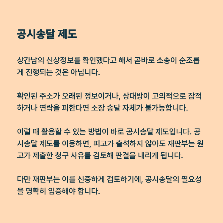 다만 상대방이 부재한 상태에서 판단이 내려지는 만큼 재판부는 매우 신중하게 접근하며, 송달이 어려운 사유와 공시송달의 필요성을 명확히 입증해야 합니다.