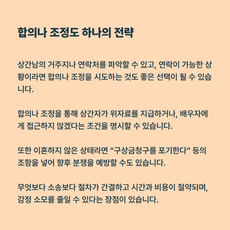 상간남의 거주지나 연락처를 파악할 수 있고, 연락이 가능한 상황이라면 합의나 조정을 시도하는 것도 좋은 선택이 될 수 있습니다.
