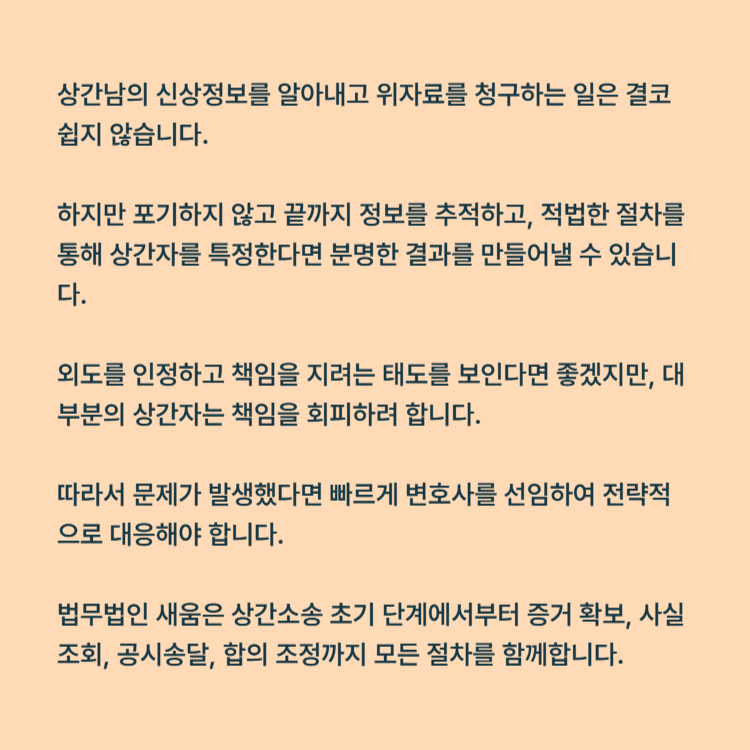 따라서 문제가 발생했다면 빠르게 변호사를 선임하여 전략적으로 대응해야 합니다. 법무법인 새움은 상간소송 초기 단계에서부터 증거 확보, 사실조회, 공시송달, 합의 조정까지 모든 절차를 함께합니다.