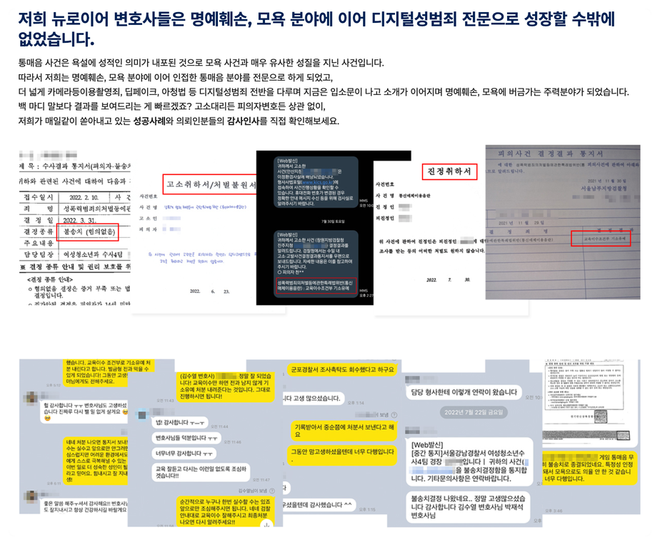 저희는 요즘 사이버를 시작으로 빈번하게 발생하는 미성년자 교제 불법 사건 등의 사건을 다수 수행하고 있습니다.