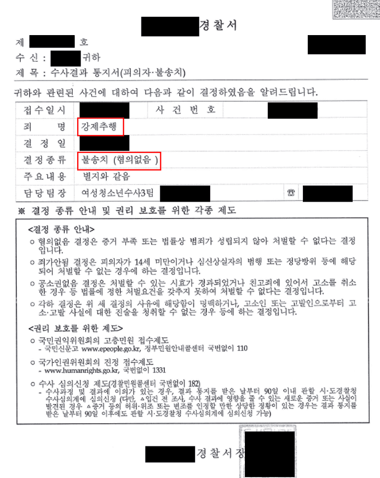 결국, 폭행은 합의가 되었으므로 불송치(공소권없음), 강제추행은 인정되지 않으므로 불송치(혐의없음) 라는 결과를 이끌어 낼 수 있었습니다.