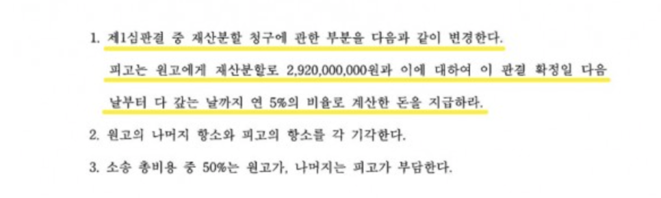 항소심에서 법률사무소 카라는 1심 패소 판결에도 불구하고 항소하여 특유재산을 재산분할 대상에 포함시켜 29억원이라는 재산분할 판결을 받아 승소하였습니다.