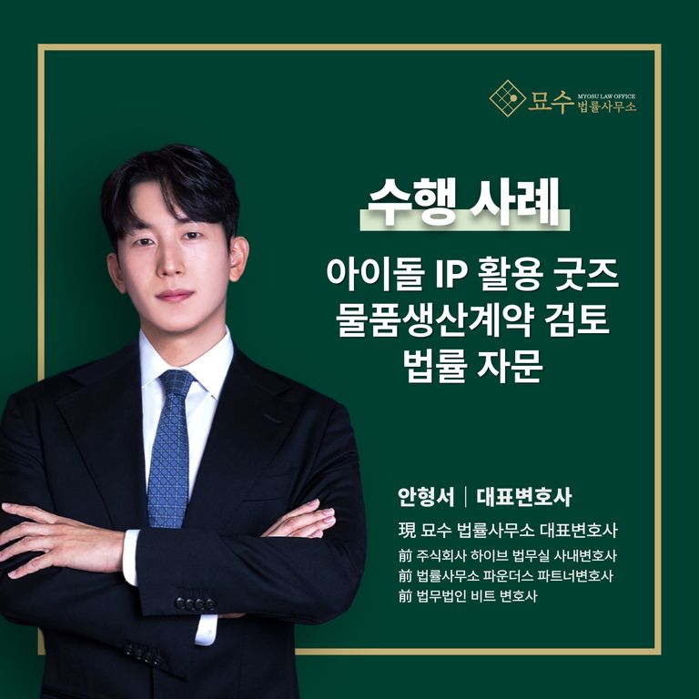 ![[스타트업] 아이돌 IP 활용 굿즈 물품생산계약 검토 법률 자문](/_next/image?url=https%3A%2F%2Fd2ai3ajp99ywjy.cloudfront.net%2Fuploads%2Ftitleimage%2Foriginal%2F5b163215c1363292f77851fe-original.jpg&w=3840&q=75)