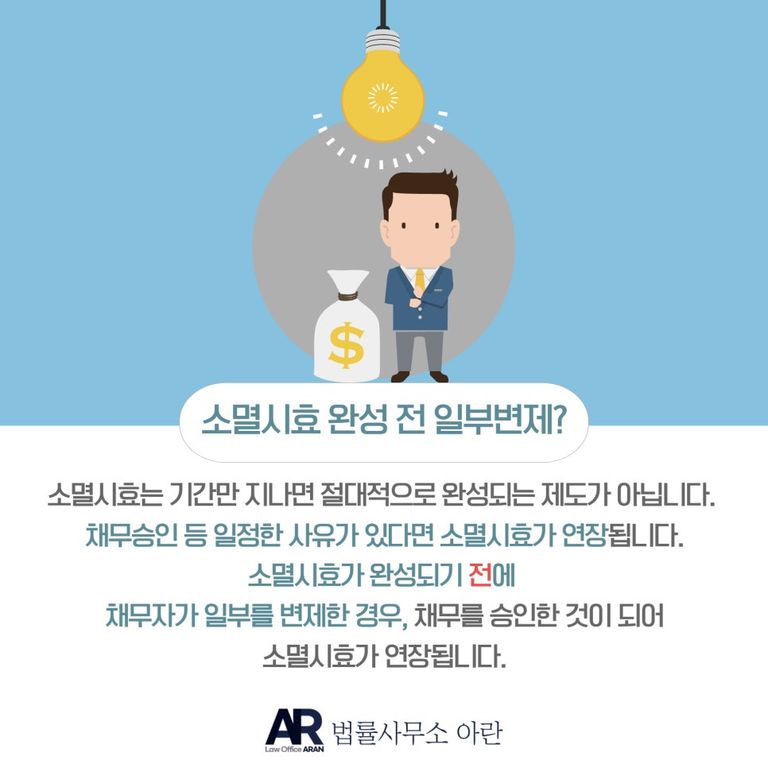 따라서 채무자가 소멸시효가 완성되기 전에 채무의 일부를 변제한 경우, 채무를 승인한 것으로 보아 그때부터 다시 3년간 소멸시효가 연장됩니다.