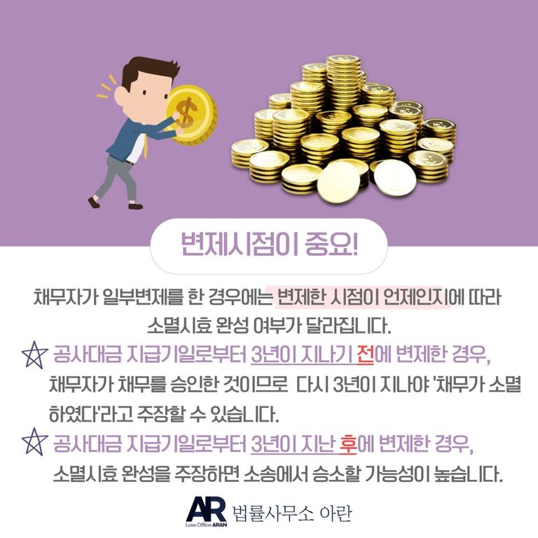 따라서 공사대금 지급기일로부터 3년이 지난 다음에 일부 변제를 한 경우, 여전히 소멸시효 완성을 주장하면 소송에서 승소할 가능성이 높습니다.