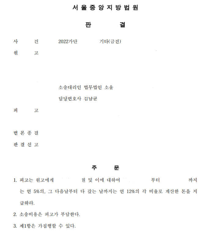 또한 소송비용 전액을 피고가 부담하도록 하여, 의뢰인의 손실이 최소화될 수 있도록 하였습니다.