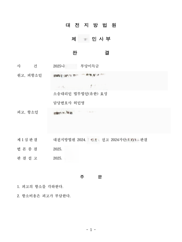 저는 즉각 입금 받은 자를 피고로 하여 민사소송 부당이득반환청구소송을 제기하였고 1심은 원고 승소 판결을 선고하였으며 피고가 추완항소를 제기했으나 2심에서 이를 각하하여 의뢰인은 피해액을 반환받았습니다.