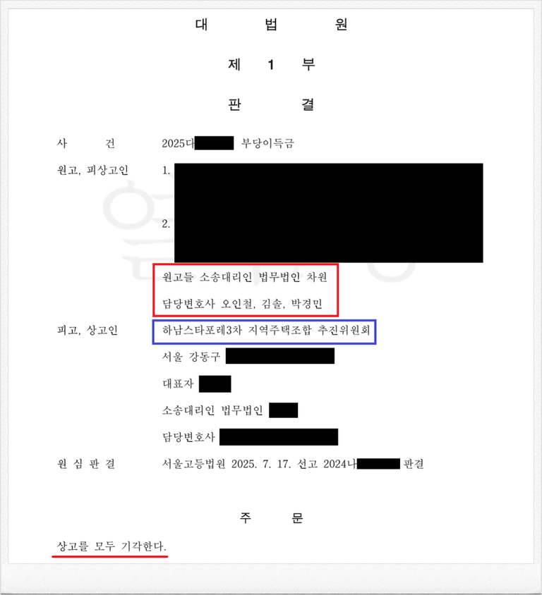 이번에도 재판부는 저의 주장을 받아들여, 피고 하남스타포레3차 지역주택조합 추진위원회 측의 상고를 기각하였고, 결국 지역주택조합 분담금 반환 소송 대법원 최종 승소 판결을 이끌어 내었습니다.