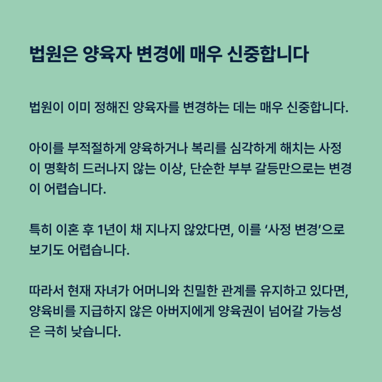 특히 이혼 후 1년이 채 지나지 않았다면, 이를 ‘사정 변경’으로 보기도 어렵습니다. 법원은 언제나 아이의 복리와 안정된 환경을 최우선으로 판단하기 때문입니다.