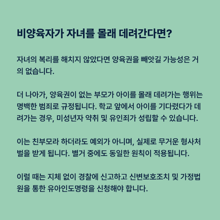자녀의 복리를 해치지 않았다면 양육권을 빼앗길 가능성은 거의 없습니다. 더 나아가, 양육권이 없는 부모가 아이를 몰래 데려가는 행위는 명백한 범죄로 규정됩니다. 초등학교나 유치원 앞에서 아이를 기다렸다가 데려가는 경우, 미성년자 약취 및 유인죄가 성립할 수 있습니다.