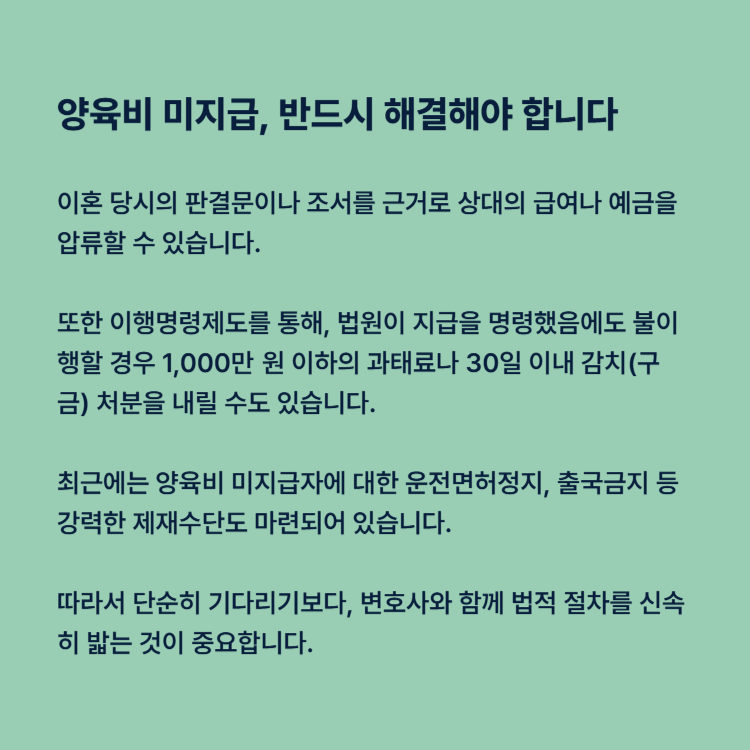이혼 당시의 판결문이나 조서를 근거로 상대의 급여나 예금을 압류할 수 있습니다. 또한 이행명령제도를 통해, 법원이 지급을 명령했음에도 불이행할 경우 1,000만 원 이하의 과태료나 30일 이내 감치(구금) 처분을 내릴 수도 있습니다.
