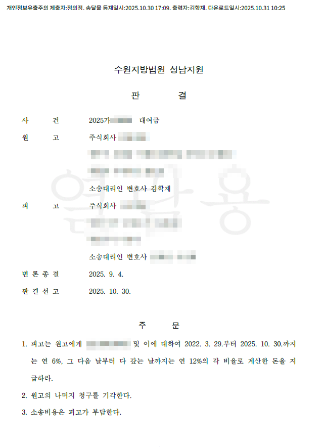 [전부승소] 2025년 10월 30일 대여금사건 전부승소
