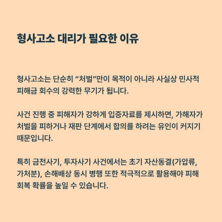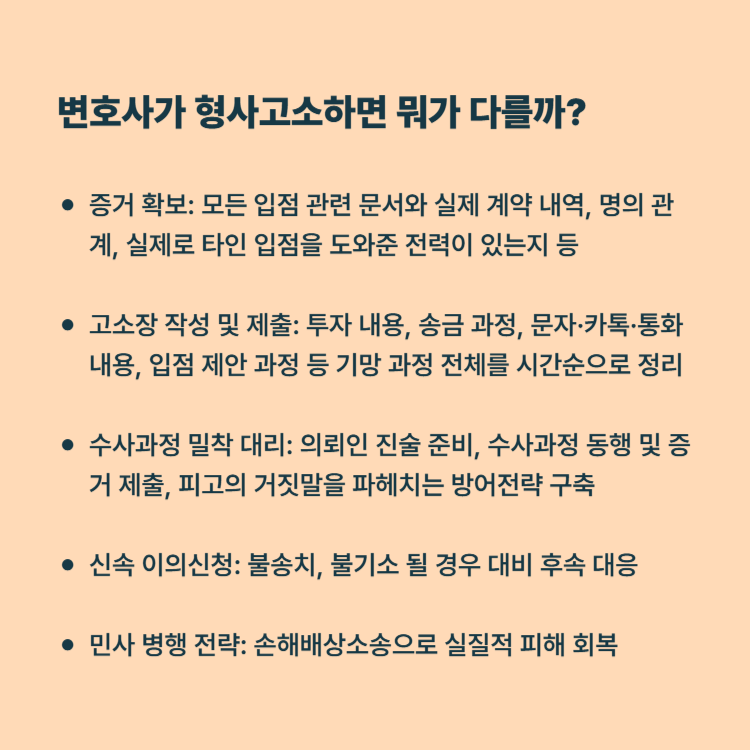 민사 병행 전략: 형사고소와 별개로 손해배상 민사소송도 준비함으로써 피해 회복 가능성을 극대화