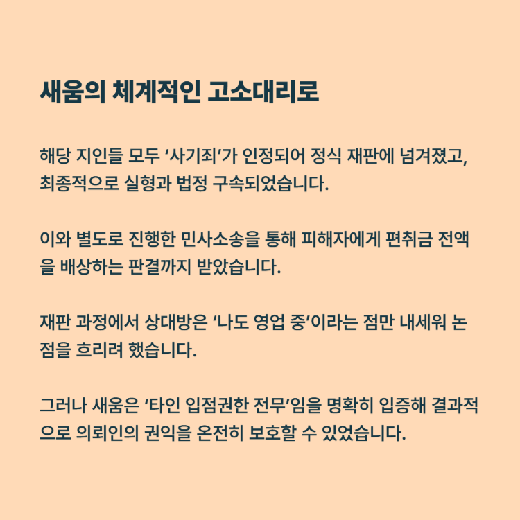 법무법인 새움의 체계적인 고소대리로, 해당 지인들 모두 ‘사기죄’가 인정되어 정식 재판에 넘겨졌고, 최종적으로 실형과 법정 구속, 피해자에게 편취금 전액을 배상하는 판결까지 받았습니다.