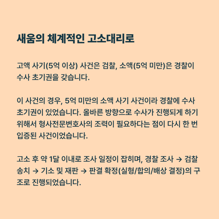 또한, 최근 형사소송법 개정으로 인해 고액 사기(5억 이상) 사건은 검찰, 소액(5억 미만)은 경찰이 수사 초기권을 갖지만, 실제 절차상 피해자가 준비한 증거와 논리 구성이 가장 중요하다는 점이 다시 한 번 입증된 사건이었습니다. 고소 후 약 1달 이내로 조사 일정이 잡히며, 경찰 조사 → 검찰 송치 → 기소 및 재판 → 판결 확정(실형/합의/배상 결정)의 구조로 진행됩니다.