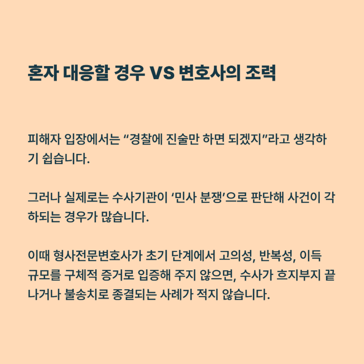 이때 형사 전문 변호사가 초기 단계에서 고의성, 반복성, 이득 규모를 구체적 증거로 입증해 주지 않으면, 수사가 흐지부지 끝나거나 불송치로 종결되는 사례가 적지 않습니다.