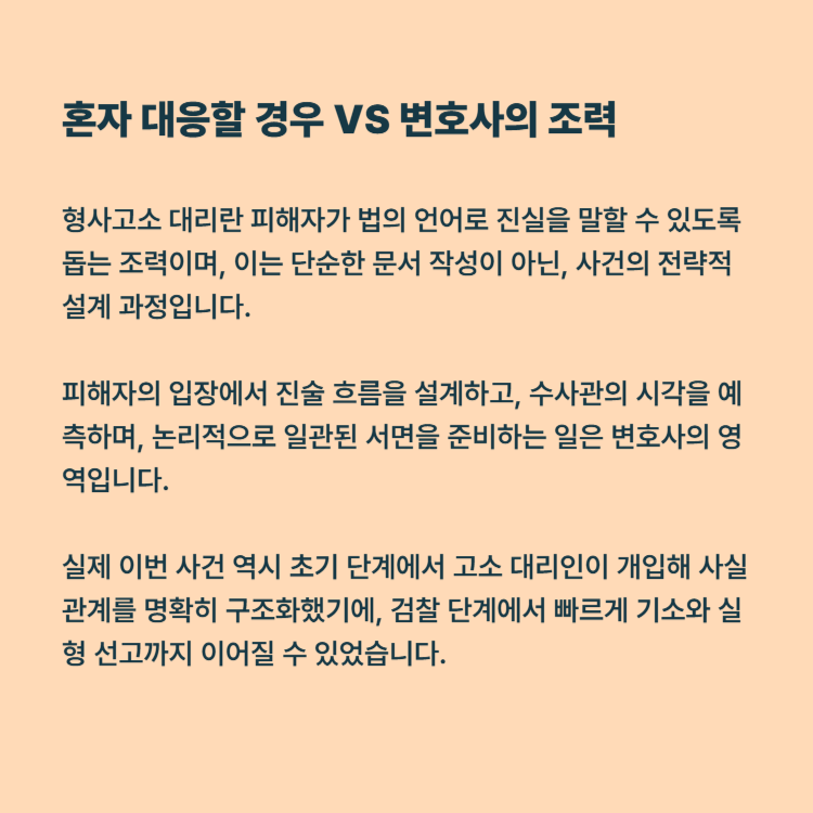 실제 이번 사건 역시 초기 단계에서 고소 대리인이 개입해 사실관계를 명확히 구조화했기에, 검찰 단계에서 빠르게 기소와 실형 선고까지 이어질 수 있었습니다.