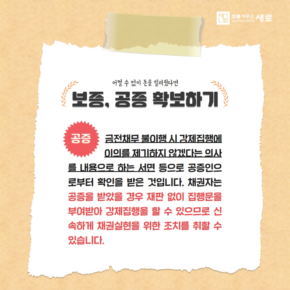 따라서 공증을 받더라도 법률상으로는 채무자의 일반재산에 대해 다른 채권자들과 평등한 지위에 있다고 볼 수 있습니다만, 재판 없이 좀 더 빨리 권리를 실현을 위한 강제집행의 조치를 취할 수 있다는 점에서 의미가 있는 것입니다.