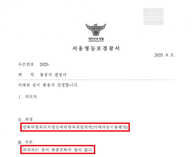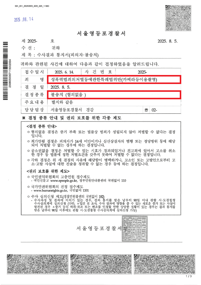 이러한 저의 조력을 바탕으로 A씨는 실수로 촬영한 것이라는 극히 이례적인 해명이었음에도 불구하고 '불송치(혐의없음)' 결정을 받음으로써 억울한 누명에서 벗어날 수 있었습니다.